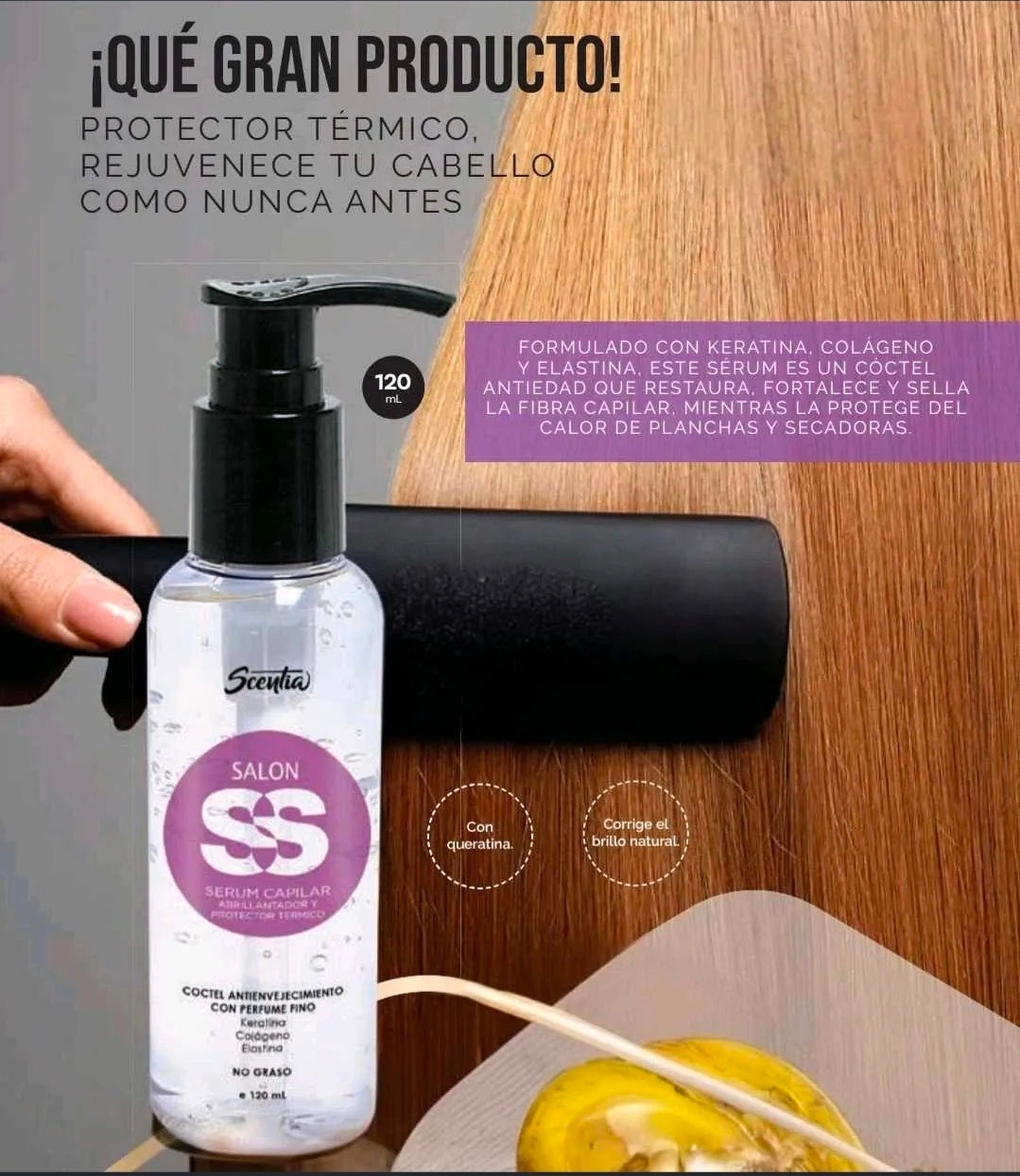 ¡Transforma tu cabello con nuestro Serúm Capilar y Protector Térmico con Keratina! Con su fórmula especial enriquecida con keratina, este serúm no solo protege tu cabello de daños causados por el calor, sino que también lo deja suave, brillante y fortalecido. Dale a tu cabello el cuidado que se merece con nuestro serúm.